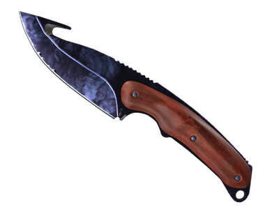 The most notable feature of a gut knife is the gut hook on the spine of the blade. Originally popularized as an aid for field dressing game, the gut hook is also effective at cutting through fibrous materials like rope, webbing, or safety belts with ease. It has been painted with black and silver metallic paints using a marbleizing medium, then candy coated. Getting lost in its color can prove fatal