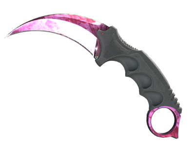 With its curved blade mimicking a tiger's claw, the karambit was developed as part of the southeast Asian martial discipline of silat. The knife is typically used with a reverse grip, with the finger ring on the index finger. It has been painted with black and silver metallic paints using a marbleizing medium, then candy coated.