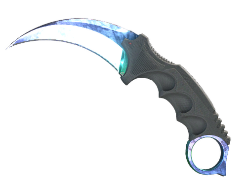 With its curved blade mimicking a tiger's claw, the karambit was developed as part of the southeast Asian martial discipline of silat. The knife is typically used with a reverse grip, with the finger ring on the index finger. It has been painted with black and silver metallic paints using a marbleizing medium, then candy coated.