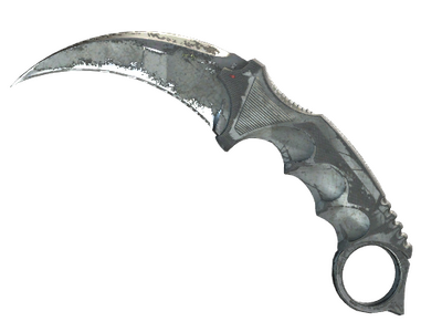 With its curved blade mimicking a tiger's claw, the karambit was developed as part of the southeast Asian martial discipline of silat. The knife is typically used with a reverse grip, with the finger ring on the index finger. It has been spray-painted using a tangle of masking tape as a stencil.