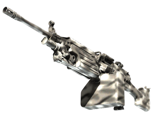A strong open-area LMG, the M249 is the perfect choice for players willing to trade a slow fire rate for increased accuracy and a high ammo capacity. It has been spray-painted freehand with short, thick lines in contrasting colors.