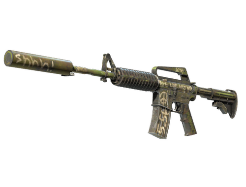 With a smaller magazine than its unmuffled counterpart, the silenced M4A1 provides quieter shots with less recoil and better accuracy. It has been hand painted in an attempt to make a suggestion about the duality of man.