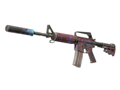With a smaller magazine than its unmuffled counterpart, the silenced M4A1 provides quieter shots with less recoil and better accuracy. A multicolored abstract paint pattern has been applied.