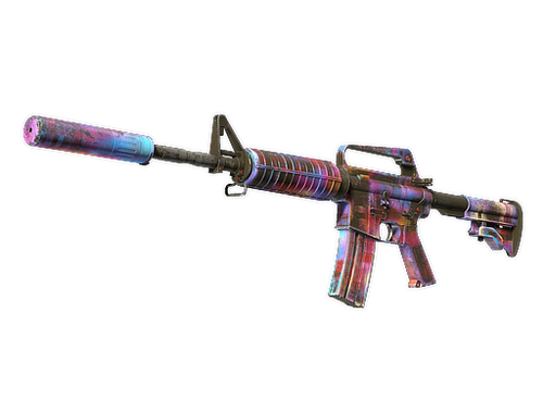 With a smaller magazine than its unmuffled counterpart, the silenced M4A1 provides quieter shots with less recoil and better accuracy. A multicolored abstract paint pattern has been applied.