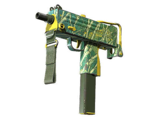 Essentially a box that bullets come out of, the MAC-10 SMG boasts a high rate of fire, with poor spread accuracy and high recoil as trade-offs. A green forest pattern has been applied.
