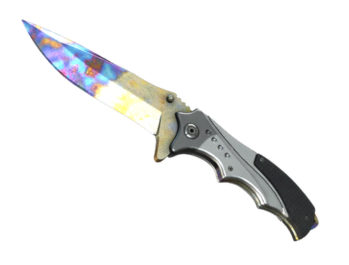 This ergonomic tactical hunting lock-blade knife features composite handle inserts and a broad, sturdy blade, useful for cutting and prying apart material. It has been color case-hardened through the application of wood charcoal at high temperatures.