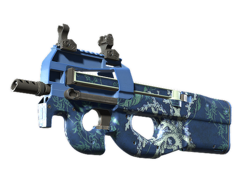 Easily recognizable for its unique bullpup design, the P90 is a great weapon to shoot on the move due to its high-capacity magazine and low recoil. A green and blue coral pattern has been applied.