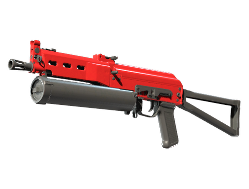 The Bizon SMG is low-damage, but offers a uniquely designed high-capacity drum magazine that reloads quickly. It has individual parts spray-painted solid colors in a red and black color scheme.