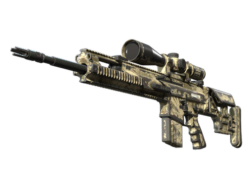 The SCAR-20 is a semi-automatic sniper rifle that trades a high rate of fire and powerful long-distance damage for sluggish movement speed and big price tag. It has been spray-painted using cardboard cutouts, fine mesh, and palm leaves as stencils. The Dust Collection
