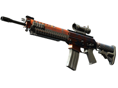 The terrorist-exclusive SG553 is a premium scoped alternative to the AK47 for effective long-range engagement. It has been hand painted with a metallic-fire themed design.