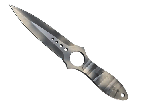 This skeletonized-tang knife has been taped at the handle for improved grip. The hole allows a finger to be threaded through for stability and safety. It has been spray-painted in a sun-dappled pattern.