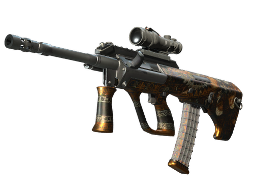 Powerful and accurate, the AUG scoped assault rifle compensates for its long reload times with low spread and a high rate of fire. It has been custom painted to depict stymphalian birds from Greek mythology.