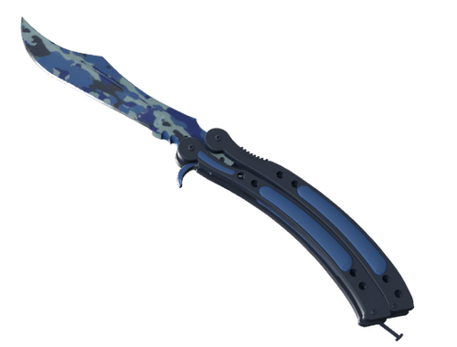 This is a custom-designed balisong, commonly known as a butterfly knife. The defining characteristic of this weapon is the fan-like opening of a freely pivoting blade, allowing rapid deployment or concealment. As a result, butterfly knives are outlawed in many countries. It has been painted using a blue camo hydrographic.