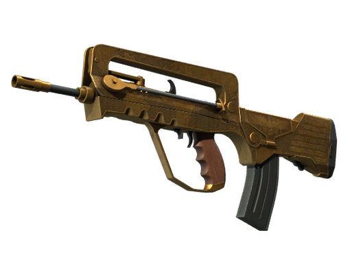 A cheap option for cash-strapped players, the FAMAS effectively fills the niche between more expensive rifles and the less-effective SMGs. It has been custom painted gold and features various details celebrating 20 years of Counter-Strike.