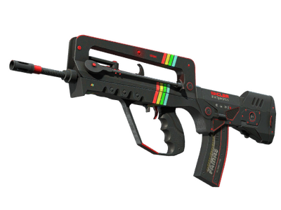 A cheap option for cash-strapped players, the FAMAS effectively fills the niche between more expensive rifles and the less-effective SMGs. This custom paint job uses gaming PCs of old as inspiration. Its black base has been finished with multicolored accents.