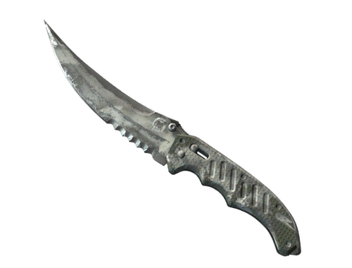 Flip knives sport a Persian-style back-swept blade with an acute point. While the point itself may be fragile, the overall design of the flip knife's design is surprisingly durable. It has been spray-painted using a tangle of masking tape as a stencil.