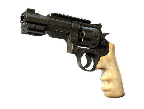 The R8 Revolver delivers a highly accurate and powerful round at the expense of a lengthy trigger-pull. Firing rapidly by fanning the hammer may be the best option when point-blank stopping power is required. The luxury of its ivory grip pairs well with the intricate metalwork on the frame, barrel, and cylinder.