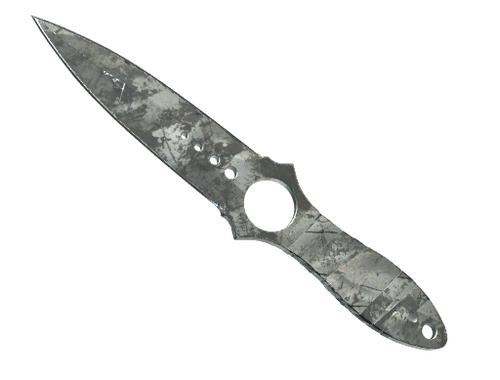 This skeletonized-tang knife has been taped at the handle for improved grip. The hole allows a finger to be threaded through for stability and safety. It has been spray-painted using a tangle of masking tape as a stencil.