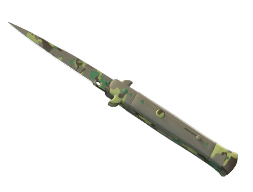 Historically a focal point of contention and even regulation, this Italian-style stiletto switchblade knife features a spring-loaded blade that can be deployed almost instantly with the push of a release catch. It has been painted using a forest camouflage hydrographic.