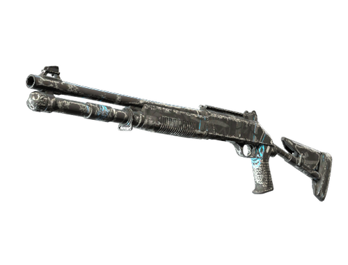 The XM1014 is a powerful fully automatic shotgun that justifies its heftier price tag with the ability to paint a room with lead fast. It has been spray-painted with a black and blue tire tread pattern.