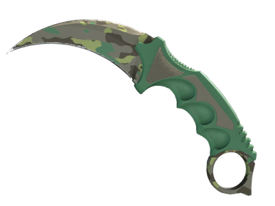 With its curved blade mimicking a tiger's claw, the karambit was developed as part of the southeast Asian martial discipline of silat. The knife is typically used with a reverse grip, with the finger ring on the index finger. It has been painted using a forest camouflage hydrographic.