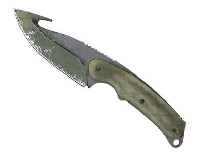 The most notable feature of a gut knife is the gut hook on the spine of the blade. Originally popularized as an aid for field dressing game, the gut hook is also effective at cutting through fibrous materials like rope, webbing, or safety belts with ease. It has been spray-painted using mesh fencing and cardboard cutouts as stencils.