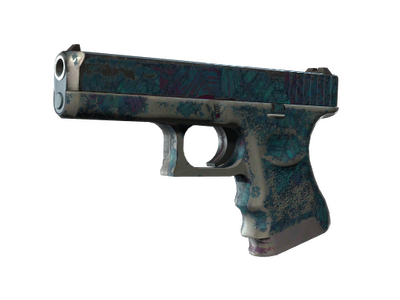 The Glock 18 is a serviceable first-round pistol that works best against unarmored opponents and is capable of firing three-round bursts. A teal and purple hydrographic pattern of overlapping leaves has been applied.
