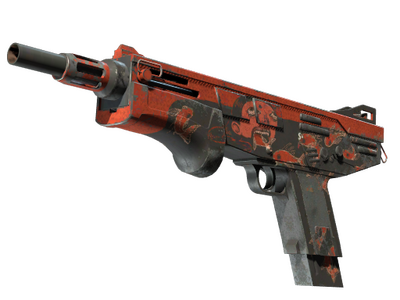 The CT-exclusive Mag-7 delivers a devastating amount of damage at close range. Its rapid magazine-style reloads make it a great tactical choice. It has been custom painted with a design depicting fish swimming into a person's mouth using an orange and black color palette.