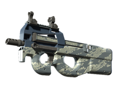 Easily recognizable for its unique bullpup design, the P90 is a great weapon to shoot on the move due to its high-capacity magazine and low recoil. A blue and grey hydrographic pattern has been applied.
