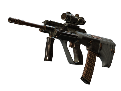 Powerful and accurate, the AUG scoped assault rifle compensates for its long reload times with low spread and a high rate of fire. It has been custom painted to replicate the look and feel of a puffer jacket and finished with bronze accents.