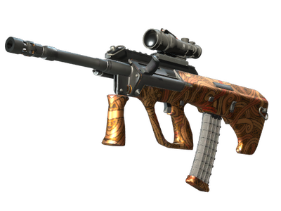Celny i potężny karabin szturmowy AUG z lunetą rekompensuje długi czas przeładowania niskim rozrzutem i wysoką szybkostrzelnością. Broń została pokryta pomarańczowym wzorem przedstawiającym Jormunganda, Węża Świata.