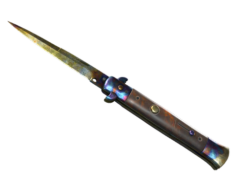 Na przestrzeni dziejów najważniejszy obiekt wielu zażartych sporów (i regulacji), ten sprężynowy nóż w stylu włoskiego sztyletu posiada ostrze mogące zostać niemal natychmiastowo rozłożone po naciśnięciu przycisku. Metalowe elementy tej broni zawdzięczają swój kolor utwardzaniu w wysokiej temperaturze z użyciem węgla drzewnego.