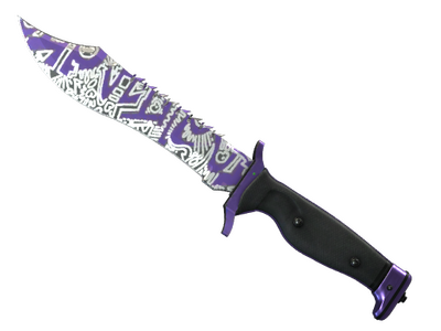 Condição: Com Pouco Uso Uma faca Bowie de lâmina parcialmente serrada, concebida para uso intensivo em situações de sobrevivência brutais. Esta arma em particular foi pintada a preto e roxo, e depois decorada com um marcador de tinta metalizada.