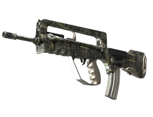 Condição: Testado no Terreno Uma opção barata quando há pouco dinheiro, a FAMAS preenche eficazmente aquele vazio entre as espingardas mais caras e as submetralhadoras menos eficientes. Esta arma em particular foi decorada com um padrão de um diagrama elétrico.