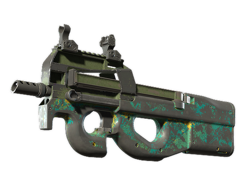 Condição: Gasto Facilmente reconhecível pelo seu design "bullpup", a P90 é uma arma ótima para dar tiros enquanto andas devido ao seu carregador de capacidade elevada e por ser uma arma com pouco recuo. Esta arma em particular foi decorada com um padrão hidrográfico de fumo amarelo sobre um fundo azul esverdeado.