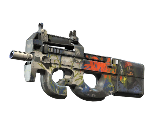 Condição: Testado no Terreno Facilmente reconhecível pelo seu design "bullpup", a P90 é uma arma ótima para dar tiros enquanto andas devido ao seu carregador de capacidade elevada e por ser uma arma com pouco recuo. Esta arma em particular foi decorada com um CT do menu principal do Counter-Strike original.