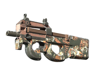 Condição: Testado no Terreno Facilmente reconhecível pelo seu design "bullpup", a P90 é uma arma ótima para dar tiros enquanto andas devido ao seu carregador de capacidade elevada e por ser uma arma com pouco recuo. Esta arma em particular foi decorada com um padrão hidrográfico de tigre com tons castanhos e beges sobre um fundo negro.