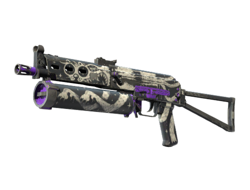Condição: Testado no Terreno A submetralhadora Bizon causa pouco dano, mas é única pelo seu enorme carregador e pode ser carregada rapidamente. Esta arma em particular foi pintada com a ilustração de um gato espacial sobre um fundo preto e roxo.