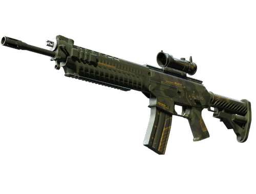 Condição: Original de Fábrica A espingarda SG553 é exclusiva para a equipa Terrorista e é uma boa alternativa com mira telescópica à AK-47 para confrontos de longa distância. Esta arma em particular foi decorada com um padrão hidrográfico moderno de camuflagem.