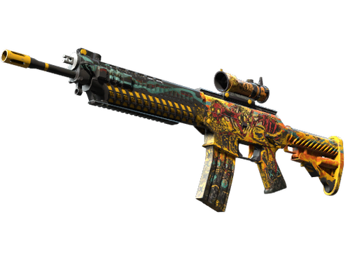 Condição: Com Pouco Uso A espingarda SG553 é exclusiva para a equipa Terrorista e é uma boa alternativa com mira telescópica à AK-47 para confrontos de longa distância. Esta arma em particular foi decorada com desenhos pintados à mão de uma formiga vermelha esquelética por cima de máscaras antigás e detalhes amarelos alaranjados.