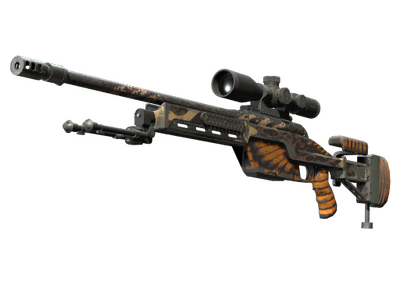 Condição: Testado no Terreno A SSG08 é uma espingarda sniper que causa relativamente pouco dano, mas o seu baixo preço torna-a numa escolha prudente em tiroteios de longas distâncias nas primeiras rondas. Esta arma em particular foi pintada à mão para se parecer com o padrão de uma borboleta-caveira.