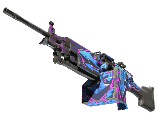 Condição: Com Muito Uso Tratando-se de uma potente metralhadora para espaços abertos, a M249 é a escolha perfeita para jogadores que não se importam de trocar uma frequência lenta de disparo por uma maior precisão e muitas balas. Esta arma em particular foi decorada com setas azuis e cor-de-rosa a apontar em todas as direções.