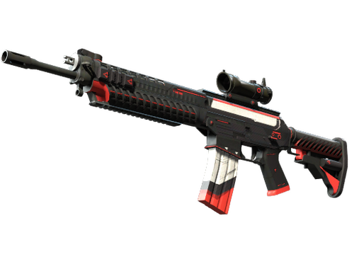 Condição: Original de Fábrica A espingarda SG553 é exclusiva para a equipa Terrorista e é uma boa alternativa com mira telescópica à AK-47 para confrontos de longa distância. Esta arma em particular foi pintada com um tema moderno em preto, branco e vermelho.