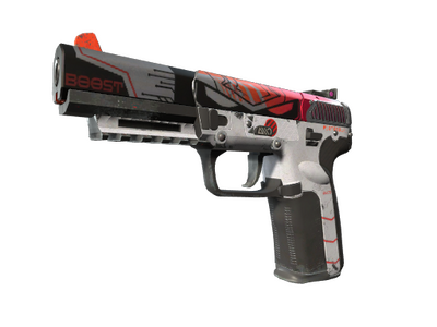 Condição: Com Muito Uso Muito precisa e útil contra oponentes com colete e capacete, a Five-Seven é cara e lenta a carregar, mas possui 20 balas no carregador e baixo recuo. Esta arma em particular foi pintada com cores de alto contraste. O ícone do robô debaixo da mira traseira combina com o desenho no ferrolho.