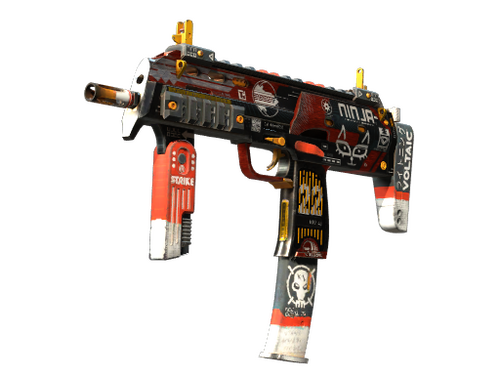 Универсальный, но дорогой пистолет-пулемёт немецкого производства MP7 — идеальный выбор для перестрелки на ближних дистанциях. На корпус нанесена красно-чёрная аквапечать, покрытая множеством белых наклеек-логотипов.