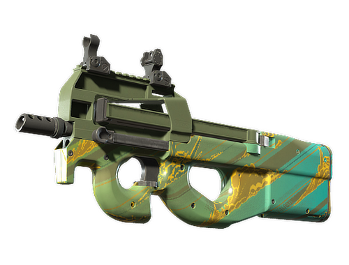 P90 легко узнать по уникальному дизайну под названием «булл-пап». Это оружие великолепно подходит для стрельбы на ходу благодаря высокой ёмкости магазина и низкой отдаче. На зелёно-голубую основу аквапечатью нанесён жёлтый узор наземной дымовой завесы.