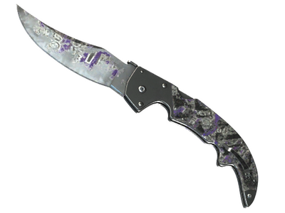 Переосмысление клинка-фальшиона с изогнутым лезвием. Металлические узоры ложатся на тёмно-фиолетовую поверхность.