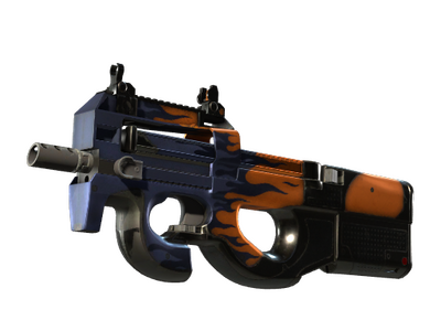 P90 легко узнать по уникальному дизайну под названием «булл-пап». Это оружие великолепно подходит для стрельбы на ходу благодаря высокой ёмкости магазина и низкой отдаче. Оранжевой и синей металлическими красками нанесён узор пламени.
