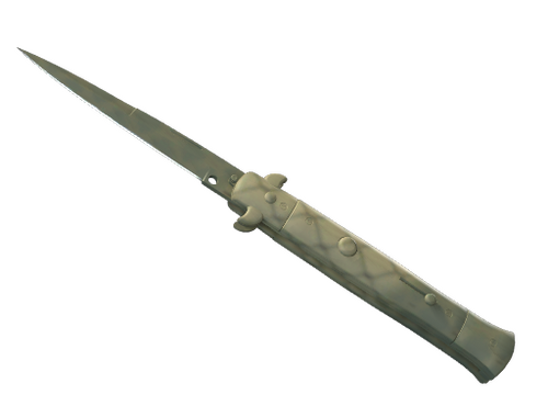 Geçmişten bu yana tartışmalara, hatta düzenlemelere konu olmuş İtalyan tarzı bu stiletto bıçağın normalde gizli duran bıçak kısmı yaylı mekanizması sayesinde tek bir dokunuşla anında ortaya çıkartılabilir. Çit örgüsü ve karton kesikleri şablonu kullanılarak boyanmıştır.