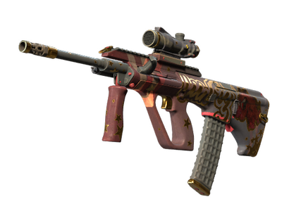 Потужна і точна гвинтівка з оптичним прицілом АУГ компенсує своє тривале перезаряджання низьким відхиленням куль та високою швидкістю стрільби. На червону основу нанесено металеве золоте оздоблення, а на прикладі зображена червона свинка.